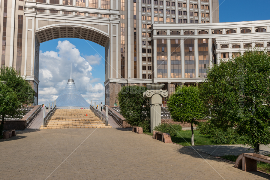 Center of capital of Kazakhstan - Astana. Building of KazMunayGaz. In the arch can be seen building of Khan-Shatyr.