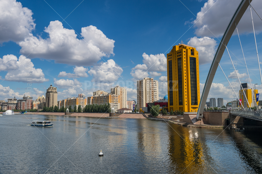Quay of the river Ishim in Astana. Bridge "Karaotkel" (Ramstore). /Astana/Astana, Kazakhstan - jule 5, 2014