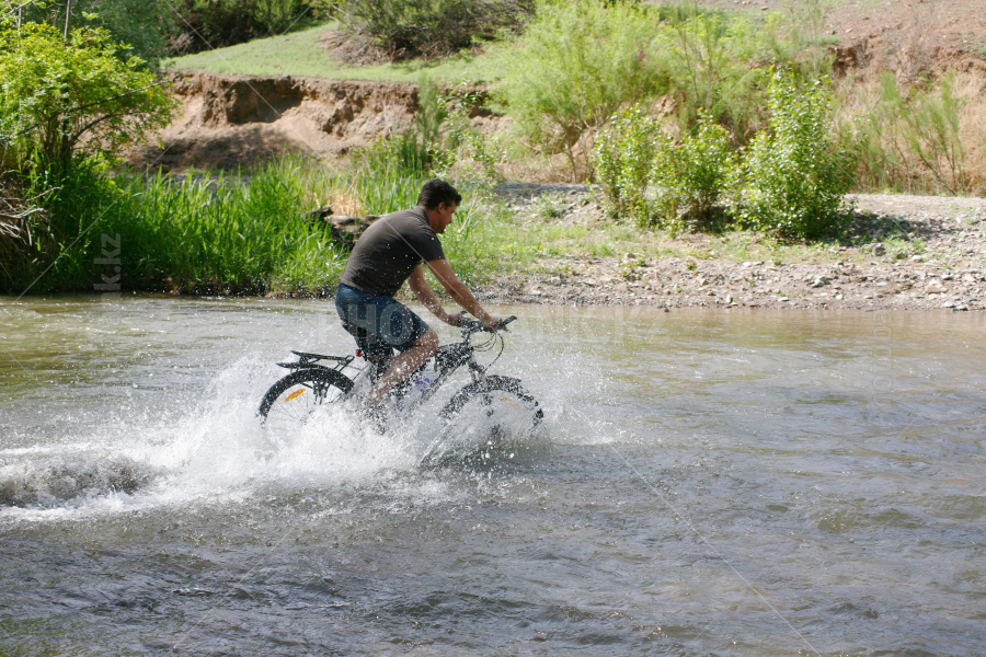 Cyclist at high speed overcomes the ford