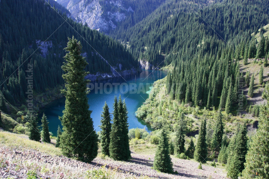 Kainde lake. Kazakhstan. Peculiarity of this lake are dry trunks of fir-trees, protrude is direct from water.