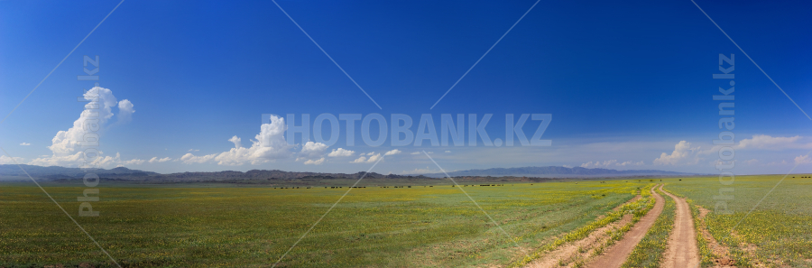 Panorama of the blooming steppe. The road, the mountains on the horizon, the clouds.