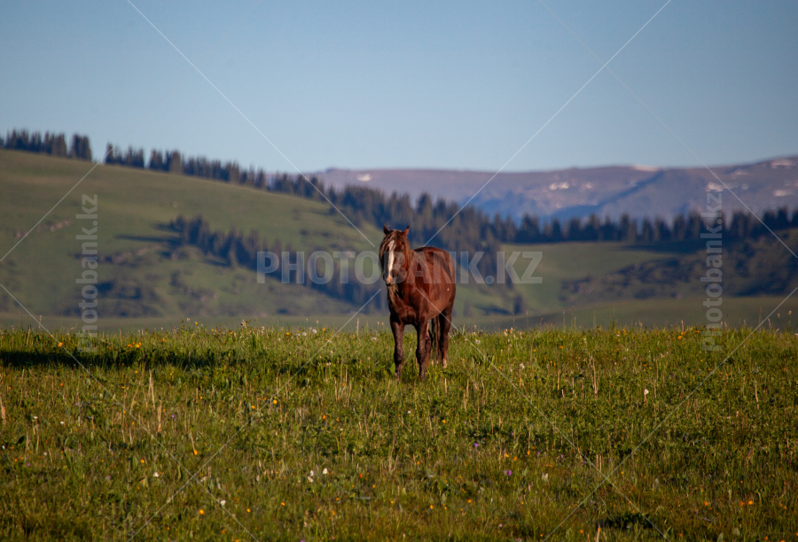 Лошадь на горном плато Ушконыр в Алматинской области.