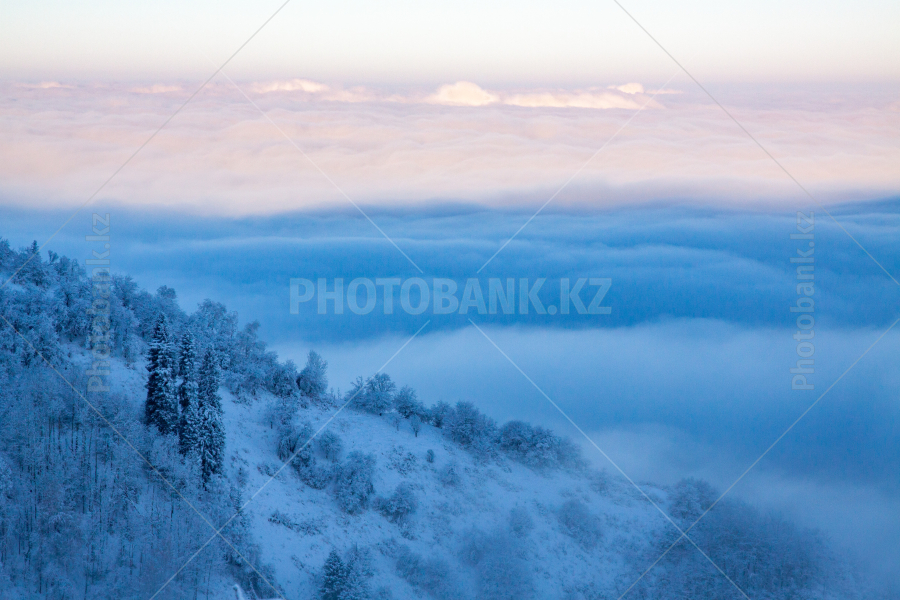 Низкая облачность (туман или смог) над Алма-Атой). Вид сверху с окрестных предгорий.