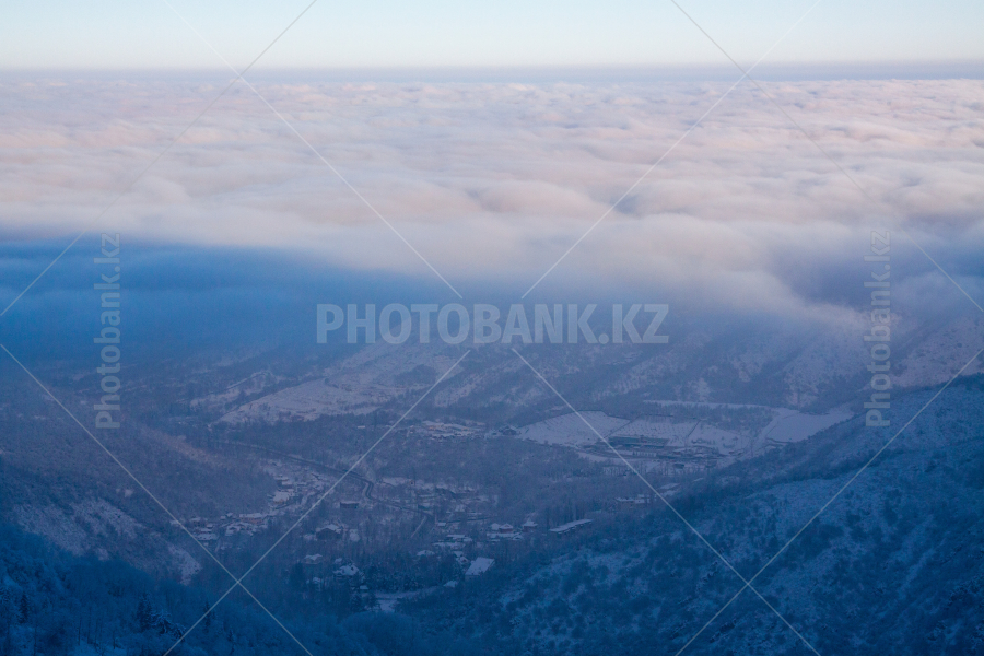 Низкая облачность (туман или смог) над Алма-Атой). Вид сверху с окрестных предгорий.