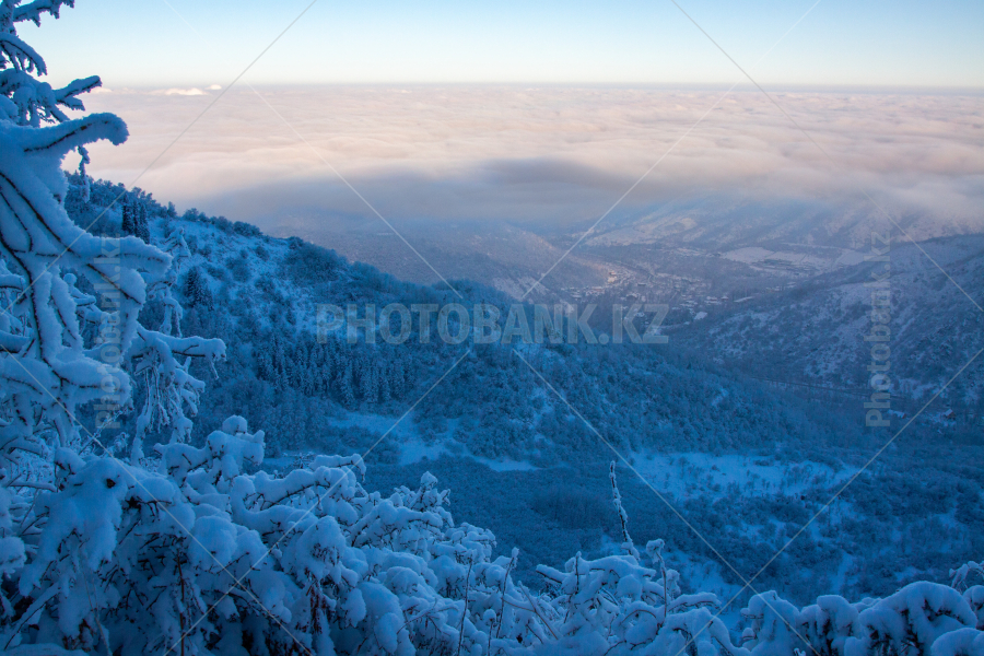Низкая облачность (туман или смог) над Алма-Атой). Вид сверху с окрестных предгорий.